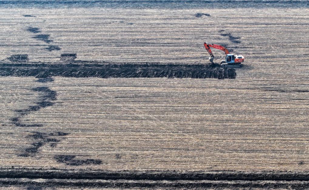 2025年3月11日,在天津市津南區(qū)八里臺鎮(zhèn)大韓莊村,工人駕駛挖掘機(jī)進(jìn)行高標(biāo)準(zhǔn)農(nóng)田施工作業(yè)(無人機(jī)照片)。新華社記者趙子碩 攝