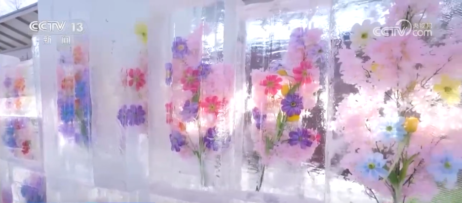 看完了霧凇,剛才說到的冰雕在哪里呢?大家看這面鮮花冰墻就是進入冰雕觀賞區(qū)的標志:它以冰塊為載體,嵌入了青海本土的郁金香、格桑花,還有西寧市花丁香花,嬌艷色彩與冰晶的純凈相互映襯。