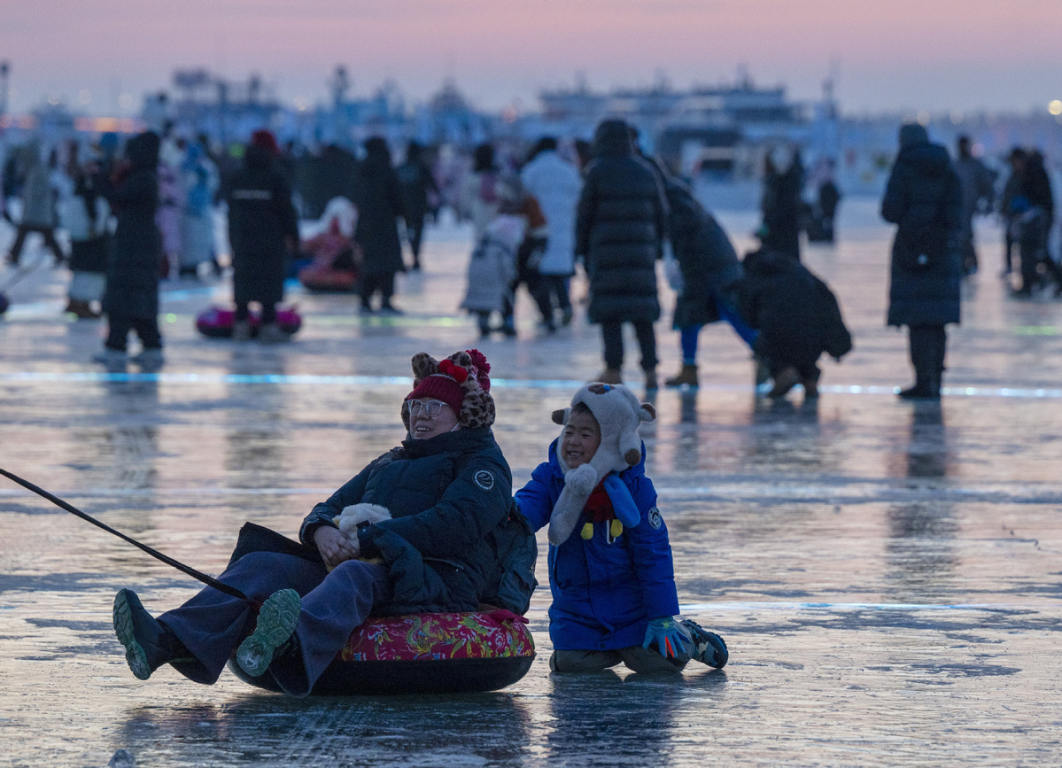 1月2日,人們在第八屆哈爾濱松花江冰雪嘉年華園區(qū)內(nèi)體驗冰上娛樂項目。(圖片來源:新華社)