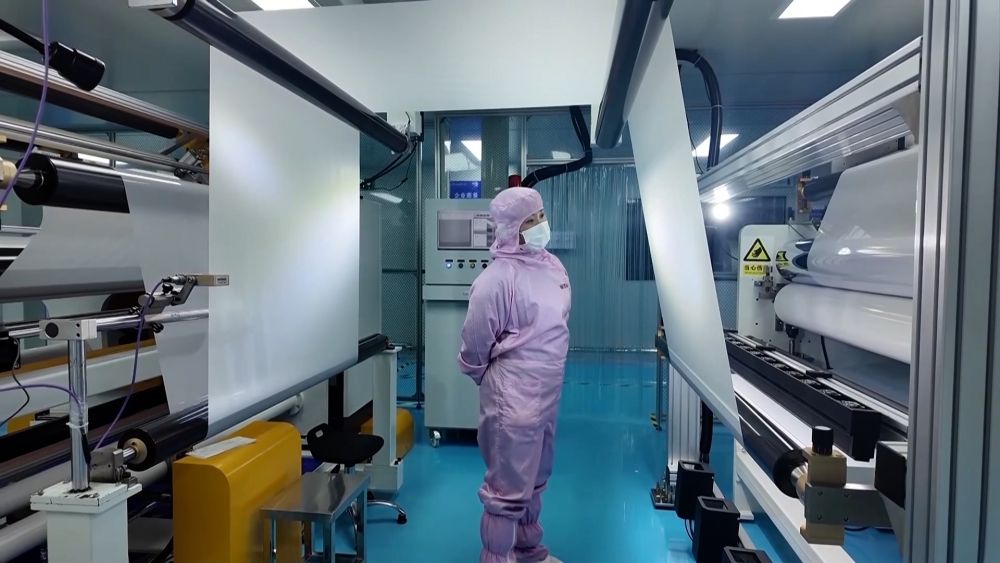 在園區(qū)內(nèi)的湖南壹鑫科技有限公司無塵生產(chǎn)車間,光學(xué)薄膜自動化生產(chǎn)線正滿負荷運轉(zhuǎn)。
