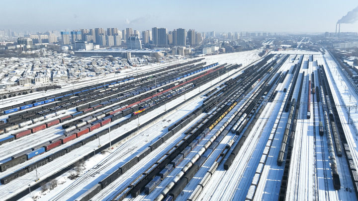 裝滿物資的貨運列車在黑龍江省哈爾濱南站編組站場整裝待發(fā)。“三九”天以來,針對北方降溫降雪天氣,中國鐵路哈爾濱局集團(tuán)有限公司哈爾濱南站積極開展電煤、生產(chǎn)物資保供專項行動,全力保障民生物資運輸需求(2026年1月15日攝,無人機(jī)照片)。新華社發(fā)(原勇 攝)
