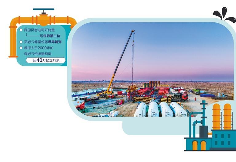 資源稟賦支撐戰(zhàn)略選擇。數(shù)據(jù)顯示,全球頁巖油儲量在11萬億噸至13萬億噸之間,頁巖氣資源量約為456萬億立方米,是當(dāng)前世界常規(guī)天然氣探明總儲量的2倍以上。我國頁巖油可采儲量居世界第三位,頁巖氣儲量位居世界前列,埋深大于2000米的煤巖氣資源量預(yù)測超40萬億立方米。