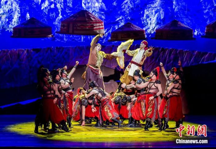 2023年4月7日,新疆烏魯木齊,原創(chuàng)歌舞劇《瑪納斯》作為首屆新疆文化藝術節(jié)優(yōu)秀劇目在新疆人民劇場上演。中新社記者 劉新 攝