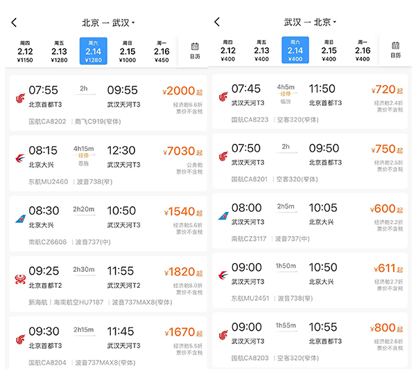 以1月30日價(jià)格為例,鐵路12306平臺顯示2月14日從北京到武漢的經(jīng)濟(jì)艙票價(jià)千元不等,而“反向出行”票價(jià)優(yōu)勢顯著。(圖片截取自鐵路12306客戶端)