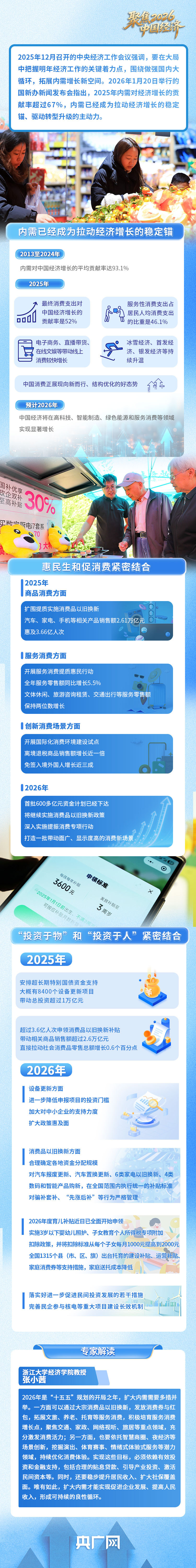國新辦最新發(fā)布的數(shù)據(jù)顯示,2025年,內(nèi)需對經(jīng)濟增長的貢獻率超過67%,其中消費貢獻率達到52%。新需求引領(lǐng)新供給,新供給創(chuàng)造新需求,已經(jīng)形成了良性互動。同時,國內(nèi)供強需弱的矛盾比較突出,中國經(jīng)濟如何向“內(nèi)”求變?2026年擴大內(nèi)需工作應(yīng)從哪些方面著手,最終惠及民生?央廣網(wǎng)邀請相關(guān)專家進行解讀。