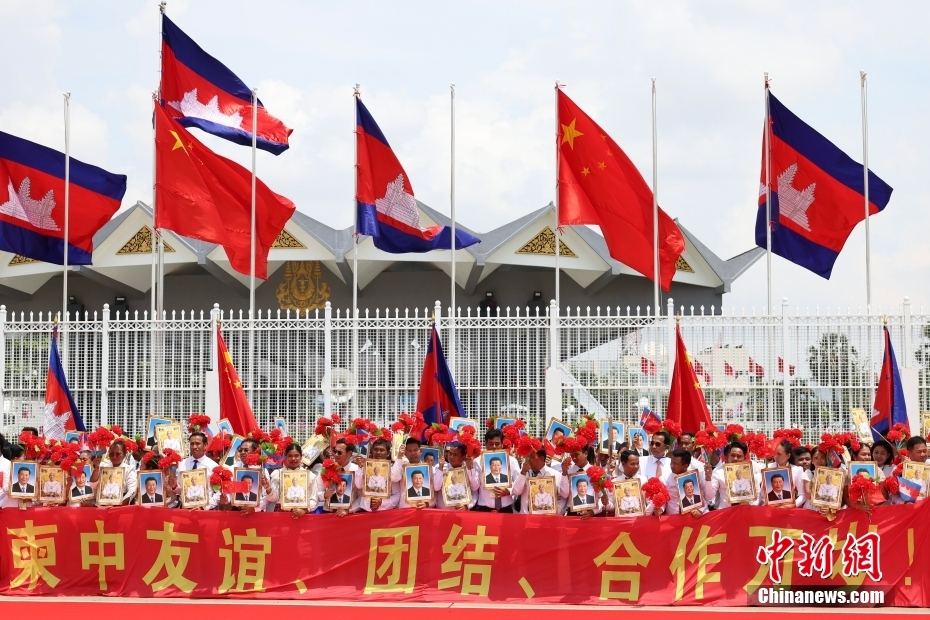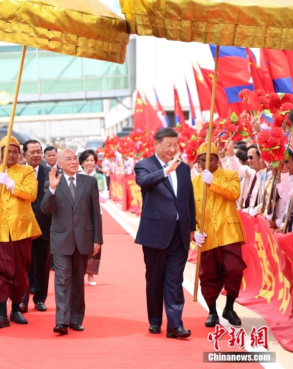 習(xí)近平抵達(dá)柬埔寨時(shí),在停機(jī)坪現(xiàn)場,禮兵分列紅毯兩側(cè),軍樂團(tuán)奏起中柬兩國國歌,數(shù)百名當(dāng)?shù)孛癖姄]舞中柬國旗,歡迎鐵桿朋友再次到訪。