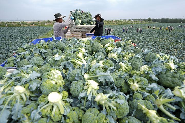 2025年7月18日,工作人員在寧夏固原市原州區(qū)彭堡鎮(zhèn)萬畝冷涼蔬菜基地運輸西蘭花。固原依托高海拔、氣候冷涼等“冷資源”優(yōu)勢,大力發(fā)展冷涼蔬菜產(chǎn)業(yè),著力打造“六盤山冷涼蔬菜”區(qū)域公用品牌。目前已建成冷涼蔬菜規(guī)?;N植基地130余個,種植面積穩(wěn)定在50萬畝,年產(chǎn)鮮菜200萬噸以上?!傲P山冷涼蔬菜”這張打造的“綠色名片”,已成為當(dāng)?shù)剜l(xiāng)村振興發(fā)展之路上的“熱產(chǎn)業(yè)”