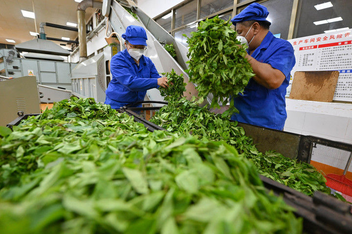 2025年6月7日,工人在海南省農(nóng)墾五指山茶業(yè)集團股份有限公司保亭金江五指山分公司茶廠加工茶葉。海南大葉茶是海南省中部山區(qū)特有的茶種,在2024年被證實和發(fā)現(xiàn)是一種新的山茶屬物種。目前,五指山、保亭、白沙等市縣不斷擴大種植規(guī)模,將茶產(chǎn)業(yè)作為鞏固脫貧攻堅和推進鄉(xiāng)村振興的重要抓手,把綠葉變成百姓致富“黃金葉”。