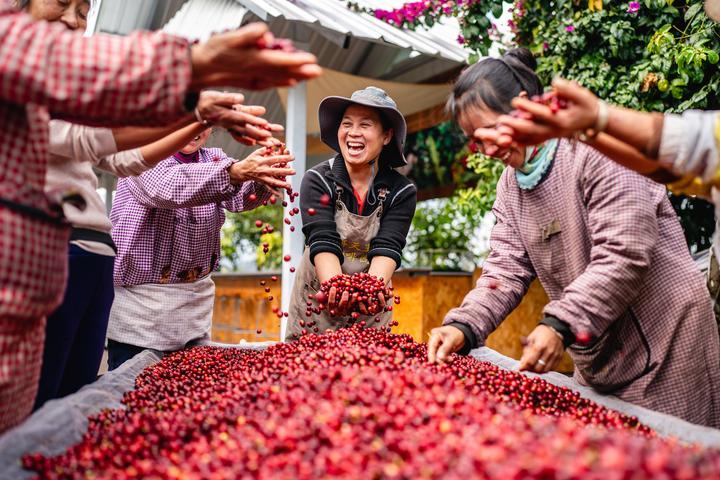 2025年1月8日,在云南省普洱市思茅區(qū)天玉咖啡莊園,工作人員慶祝今年咖啡豐收。目前,普洱市咖啡種植面積達67.9萬畝,2023到2024年產(chǎn)季咖啡生豆產(chǎn)量5.8萬噸,穩(wěn)居中國咖啡種植面積與產(chǎn)量之首。