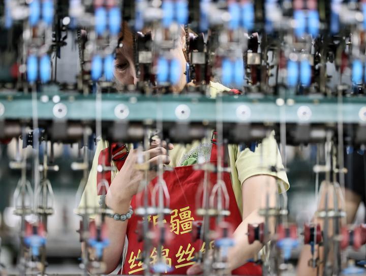 2025年7月29日,工人在新疆絲錦絲綢紡織有限公司生產(chǎn)車間內(nèi)的自動繅絲機上作業(yè)。近年來,新疆塔城地區(qū)烏蘇市引進桑蠶繭絲綢智能化全產(chǎn)業(yè)鏈項目,鼓勵農(nóng)民種桑養(yǎng)蠶,拓寬興邊富民新“絲”路。