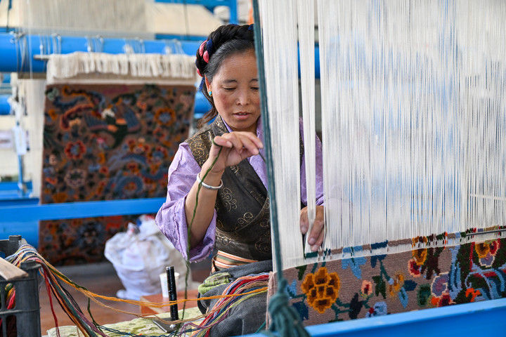 2025年7月18日,江孜藏毯文化發(fā)展有限責(zé)任公司的員工在生產(chǎn)車間內(nèi)編織藏毯。西藏日喀則市江孜縣是著名的藏毯(藏族稱為“卡墊”)之鄉(xiāng),織毯歷史悠久。藏族卡墊織造技藝于2006年被列入國家級非物質(zhì)文化遺產(chǎn)代表性項目名錄。近年來,江孜藏毯在守護傳統(tǒng)技藝的同時積極創(chuàng)新,通過建立合作社、開辦技能培訓(xùn)班等方式擴大靈活就業(yè)規(guī)模,讓更多人在家門口織藏毯增收。