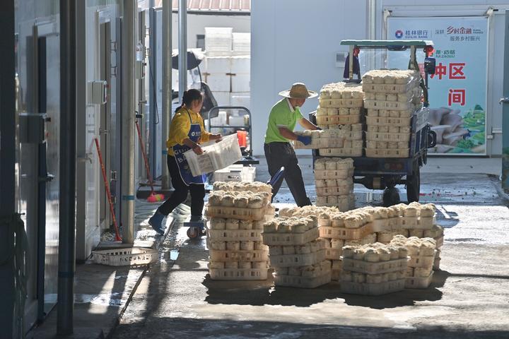 2024年10月31日,村民在廣西百色市德??h那造村食用菌生產(chǎn)基地搬運采摘的蘑菇。那造村通過做優(yōu)特色產(chǎn)業(yè)、豐富村民生活、完善基礎(chǔ)設(shè)施等多項具體舉措,推動各項事業(yè)快速發(fā)展。