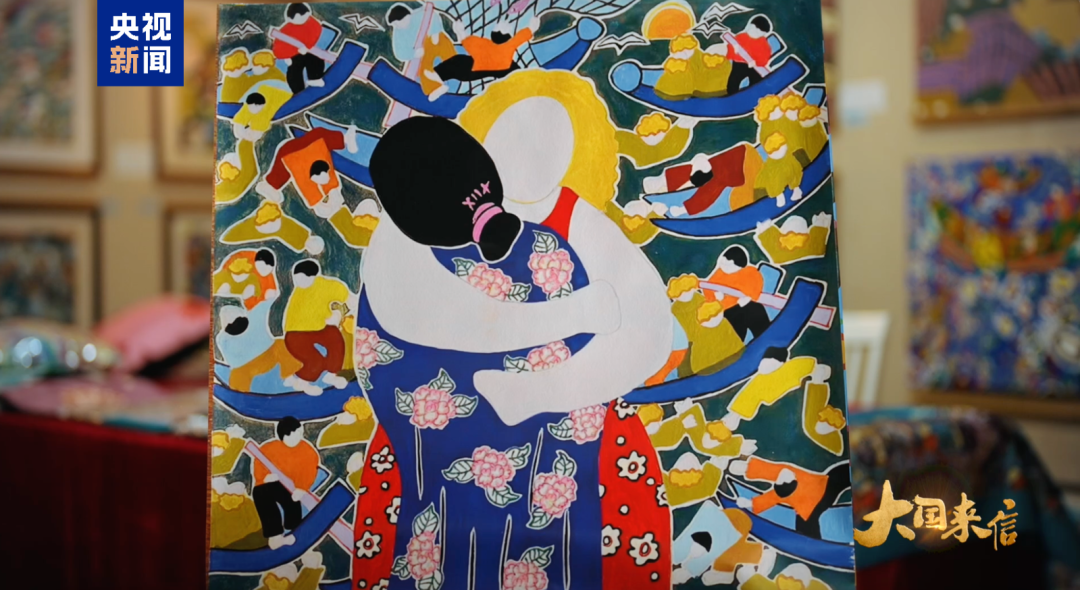 吳小飛也回贈(zèng)了一件禮物。由于她是一名漁民畫創(chuàng)作者,于是就把一幅名為《擁抱》的作品創(chuàng)作出來送給了對(duì)方。在她看來,這不但是她們兩個(gè)人的擁抱,也是國和國的擁抱。