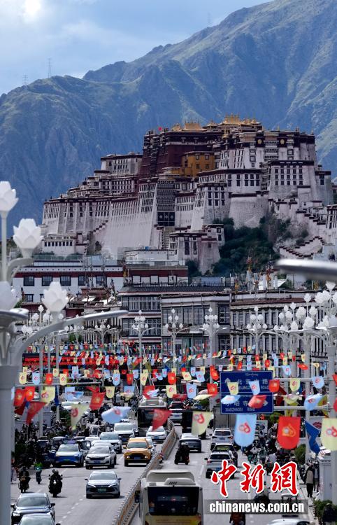 8月19日,隨著西藏自治區(qū)成立60周年慶?;顒?dòng)臨近,拉薩氛圍濃。圖為拉薩街頭彩旗飄揚(yáng)。中新社記者 李林 攝