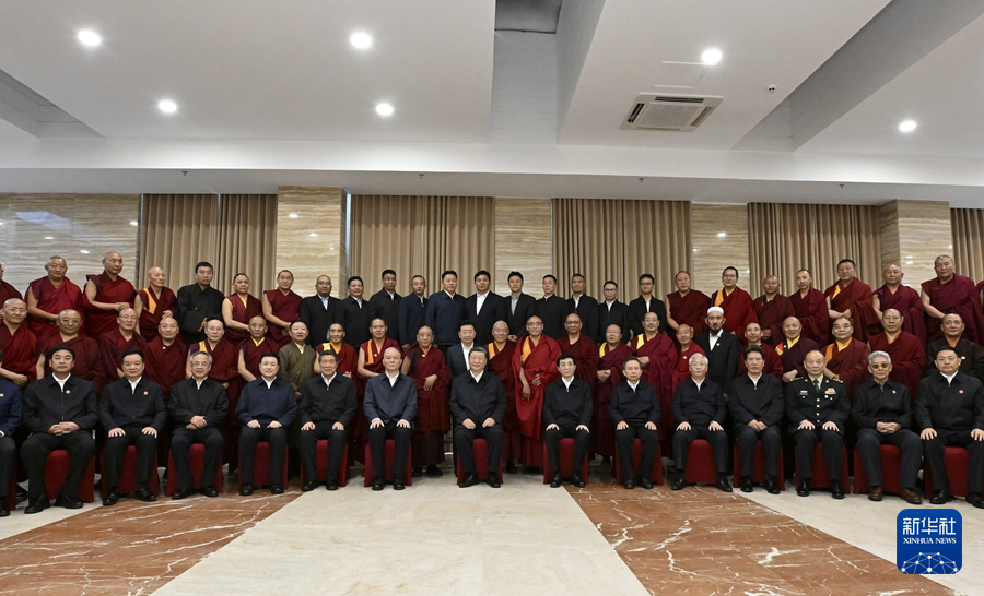 8月20日下午,中共中央總書記、國(guó)家主席、中央軍委主席習(xí)近平在拉薩親切接見(jiàn)西藏自治區(qū)宗教界愛(ài)國(guó)人士和寺管會(huì)干部代表,并同大家合影留念。新華社記者 李響 攝