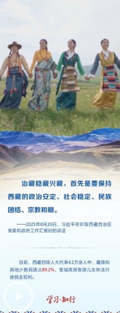 2025年8月20日,習近平總書記率中央代表團乘專機抵達拉薩,出席西藏自治區(qū)成立60周年慶?;顒印T诼犎∥鞑刈灾螀^(qū)黨委和政府工作匯報時,習近平總書記強調,“持續(xù)深入抓好穩(wěn)定、發(fā)展、生態(tài)、強邊四件大事,努力建設團結富裕文明和諧美麗的社會主義現(xiàn)代化新西藏”。