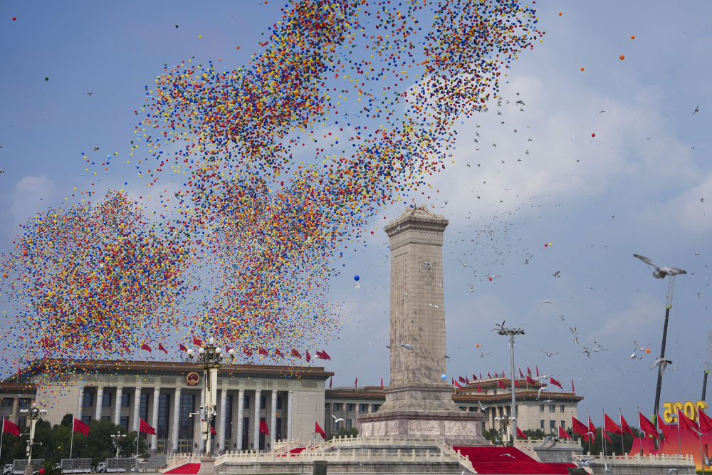 2025年9月3日,紀念中國人民抗日戰(zhàn)爭暨世界反法西斯戰(zhàn)爭勝利80周年大會在北京隆重舉行。這是紀念大會現(xiàn)場放飛氣球和鴿子。新華社記者 牟宇 攝
