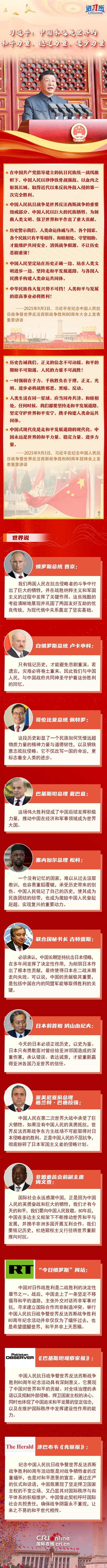 “中國(guó)永遠(yuǎn)是世界的和平力量、穩(wěn)定力量、進(jìn)步力量。”從創(chuàng)建聯(lián)合國(guó)到提出和平共處五項(xiàng)原則,再到推動(dòng)構(gòu)建人類(lèi)命運(yùn)共同體,中國(guó)始終面向光明,做世界和平與安全的堅(jiān)定維護(hù)者。國(guó)際社會(huì)高度評(píng)價(jià)中國(guó)為世界反法西斯戰(zhàn)爭(zhēng)勝利作出的巨大貢獻(xiàn),認(rèn)為抗戰(zhàn)不僅改寫(xiě)中國(guó)的命運(yùn),更標(biāo)志著全人類(lèi)的進(jìn)步;戰(zhàn)后的中國(guó)走上了一條堅(jiān)定不移倡導(dǎo)和平發(fā)展的道路,并以此次紀(jì)念活動(dòng)為契機(jī),呼吁國(guó)際社會(huì)共擔(dān)責(zé)任,確保戰(zhàn)爭(zhēng)陰霾永不重現(xiàn),讓來(lái)之不易的和平世代相傳。