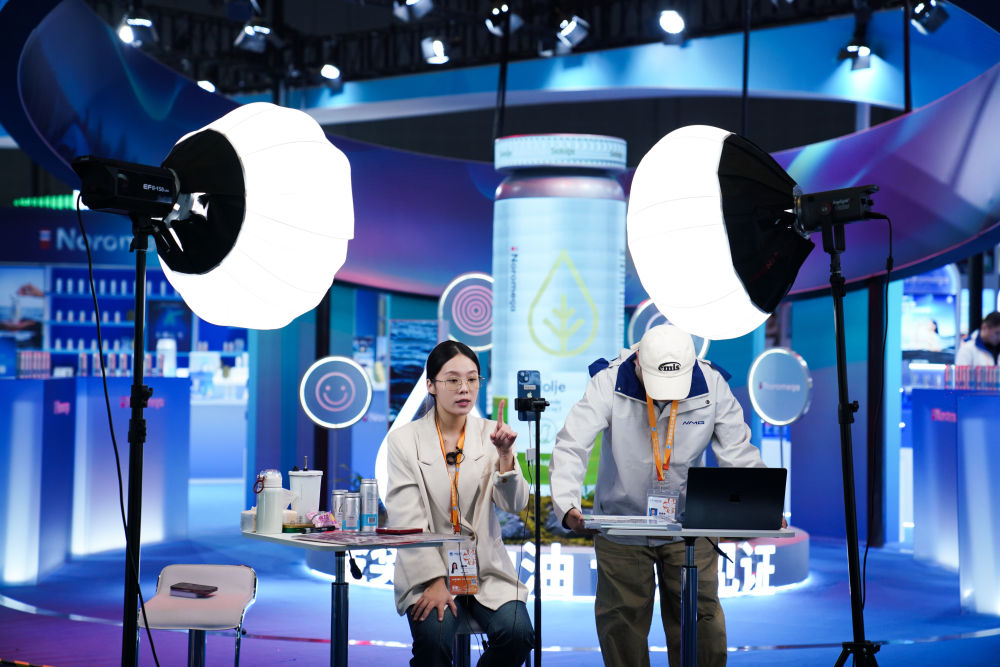 2025年11月4日,工作人員在第八屆進(jìn)博會醫(yī)療器械及醫(yī)藥保健展區(qū)直播。本屆進(jìn)博會直播密度大、形式多樣,有的展位專門搭建直播區(qū)域,燈光、背景、展板一應(yīng)俱全;有的展位手機一架、產(chǎn)品一擺,直播就地開始;還有的直播間是“流動的”,達(dá)人主播們拿著手機、別著麥克風(fēng),穿梭于各個品牌展位間現(xiàn)場推薦……八年來,進(jìn)博會影響力逐年遞增,越來越多的中國消費者愿意通過直播了解進(jìn)博會上的“全球好物”。