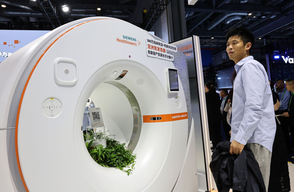 2025年11月6日,參觀者在第八屆進(jìn)博會醫(yī)療器械及醫(yī)藥保健展區(qū)西門子醫(yī)療展臺駐足觀看一款亞洲首發(fā)首展的CT機展品。進(jìn)博會是全球新品首發(fā)地,更被視為前沿技術(shù)“首秀地”。
