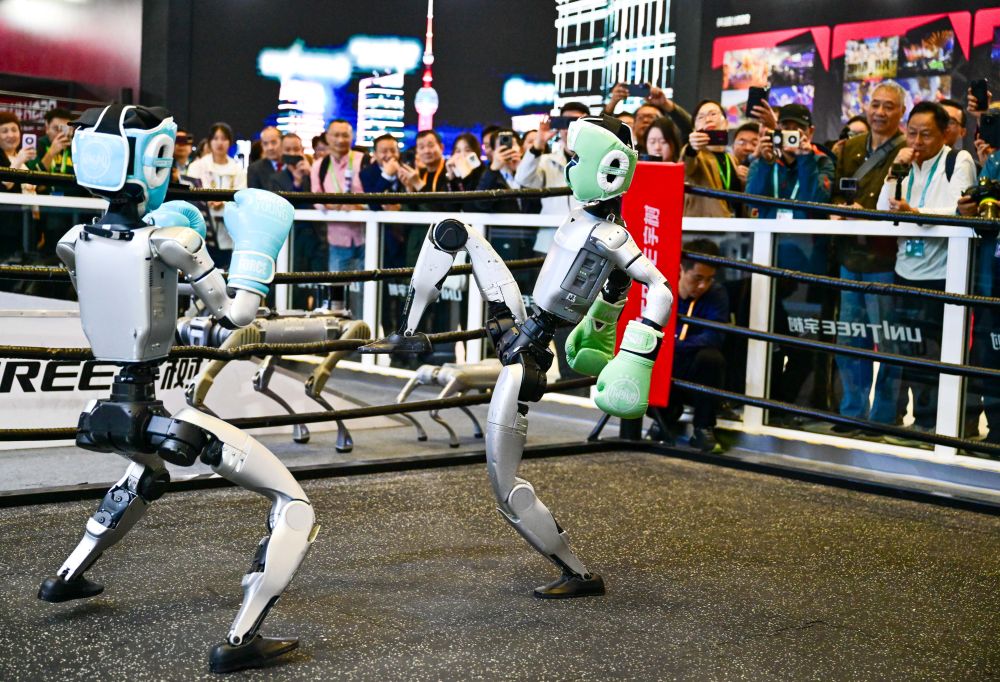 2025年11月6日,人形機器人在第八屆進(jìn)博會宇樹科技展臺進(jìn)行格斗表演。當(dāng)日,在技術(shù)裝備展區(qū)宇樹科技展臺,兩臺G1人形機器人的格斗表演吸引了眾多觀眾。它們戴著護具及拳套,施展直拳、勾拳、左右鞭腿,展示倒地自主起身等復(fù)雜動作,不時贏得觀眾喝彩。