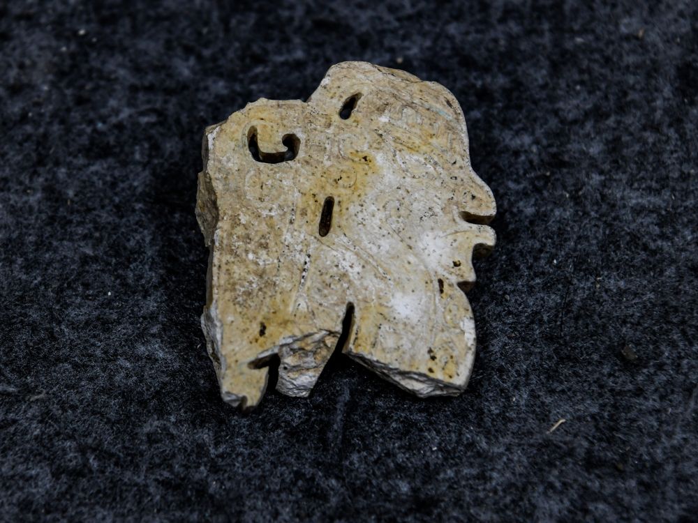 2024年7月10日在四川省文物考古研究院拍攝的三星堆遺址出土的玉石上陽刻的側身人像。三星堆遺址新發(fā)現(xiàn)與玉石器生產加工相關的遺存,專家初步判斷為玉石器“生產車間”,年代為商代中期,距今約3500年至3400年。
