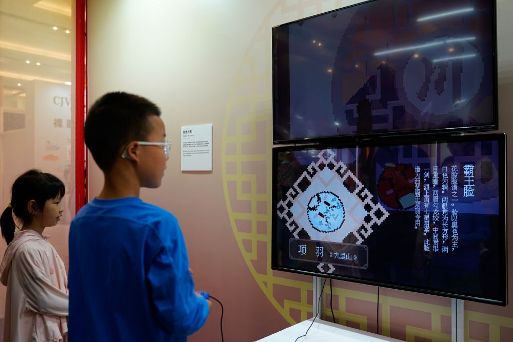 2025年5月31日,在第九屆中國成都國際非物質文化遺產節(jié)上,小朋友通過互動游戲了解川劇臉譜。