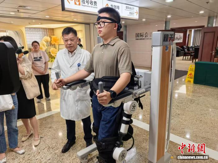 “大腦想什么,機(jī)器就幫你做什么?!爆F(xiàn)場醫(yī)務(wù)人員邊調(diào)試設(shè)備邊解釋道,“以這套腦機(jī)接口主動(dòng)康復(fù)系統(tǒng)為例,就是通過腦電信號(hào)把運(yùn)動(dòng)想象變成操作指令,驅(qū)動(dòng)外骨骼或機(jī)械手完成動(dòng)作,從而幫助癱瘓患者重建神經(jīng)功能。這一技術(shù)可以為脊髓損傷、中風(fēng)等患者提供重新動(dòng)起來、站起來的可能?!?/p>