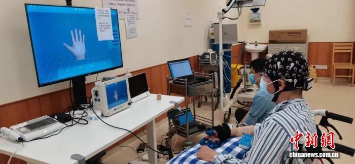 圖為腦機(jī)接口系統(tǒng)捕捉到患者的意圖后,控制手功能訓(xùn)練設(shè)備實(shí)現(xiàn)患者手的運(yùn)動(dòng)。浙江省人民醫(yī)院供圖