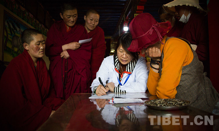 2019年5月,“同心·共鑄中國心” 醫(yī)療志愿者在拉薩市羊八井鎮(zhèn)的嘎洛寺,為寺內(nèi)尼眾進(jìn)行義診。攝影:趙耀