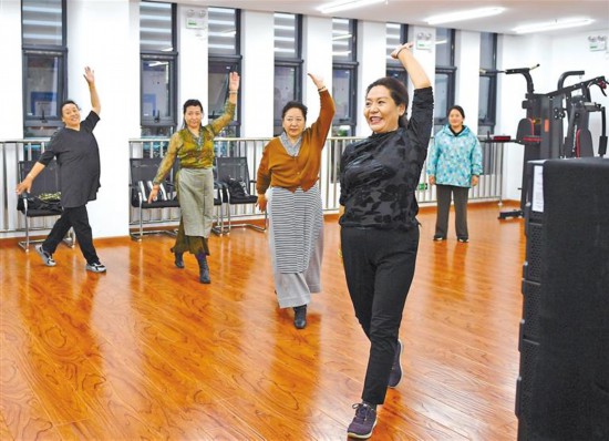 圖為老年人在拉薩市城關(guān)區(qū)老年人日間照料中心學(xué)習(xí)舞蹈。記者 旦增蘭澤 攝
