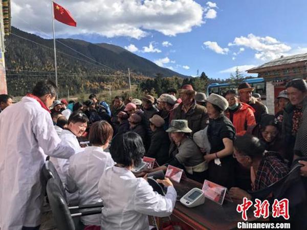 圖為援藏醫(yī)生為林芝農(nóng)牧民義診贈(zèng)藥。圖片來源:中新網(wǎng) 攝影:張寧