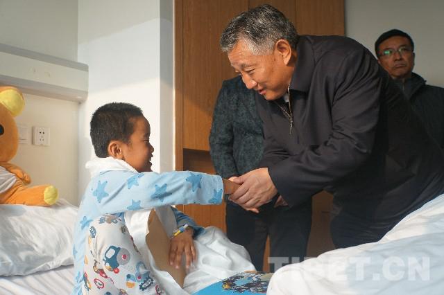 圖為各位領(lǐng)導(dǎo)在中日友好醫(yī)院看望來自甘南卓尼縣的患兒蘇奴刀旦。攝影:孫健