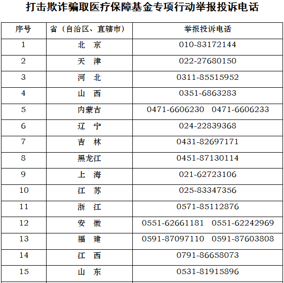 人民健康從國家醫(yī)保局獲悉,醫(yī)保局首次設(shè)立了國家級打擊欺詐騙取醫(yī)療保障基金專項行動舉報電話,并要求各地醫(yī)保部門建立舉報獎勵機(jī)制,同時對舉報嚴(yán)格保密,保護(hù)舉報人的合法權(quán)益。以群眾舉報為重點(diǎn)線索,結(jié)合醫(yī)保智能監(jiān)控、大數(shù)據(jù)分析、開展暗訪等方式,精準(zhǔn)鎖定目標(biāo),嚴(yán)厲打擊違法違規(guī)行為。目前全國各級32個“回頭看”舉報投訴電話已全面開通(文末附目錄)。