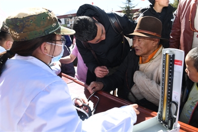 圖為近日,武警西藏總隊機(jī)動第二支隊的醫(yī)務(wù)人員免費(fèi)為群眾進(jìn)行診療。丹增群培 攝