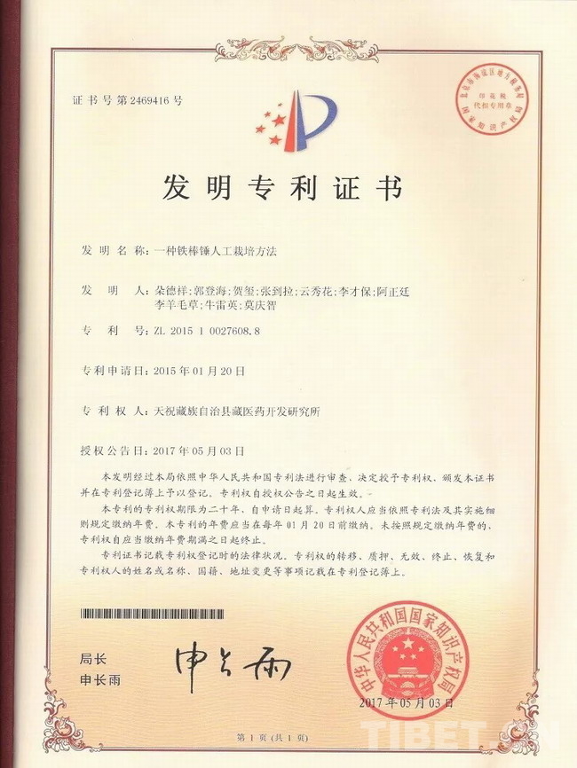 圖為天??h藏醫(yī)藥開發(fā)研究所發(fā)明的“一種鐵棒錘人工栽培方法”獲得了國家知識產(chǎn)權(quán)局發(fā)明專利。