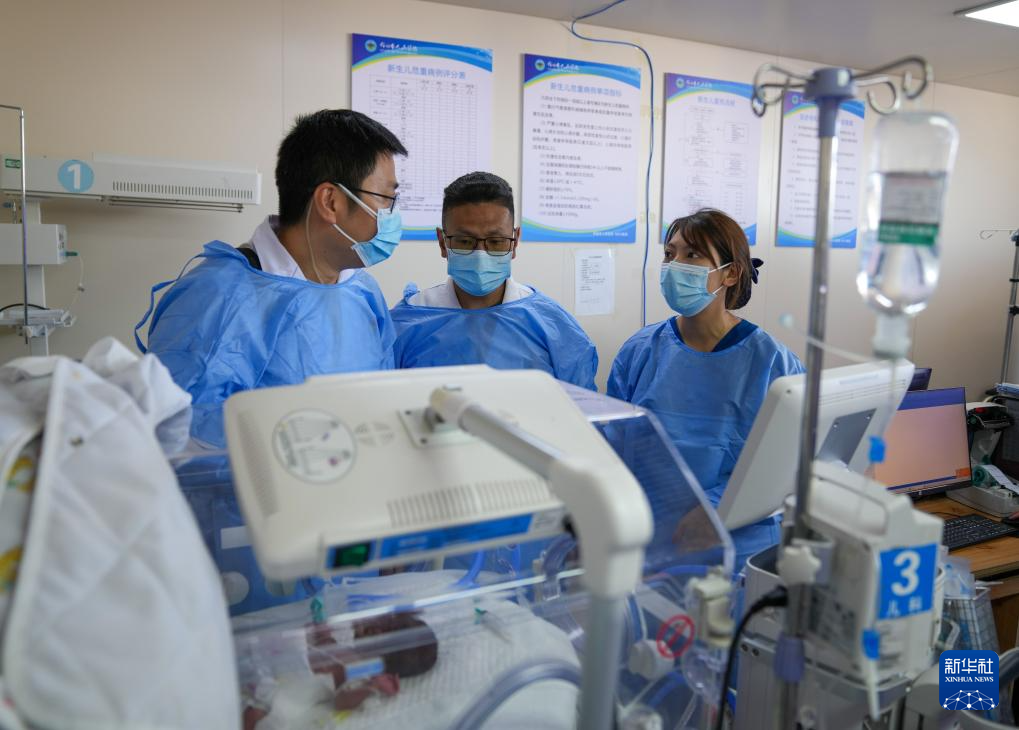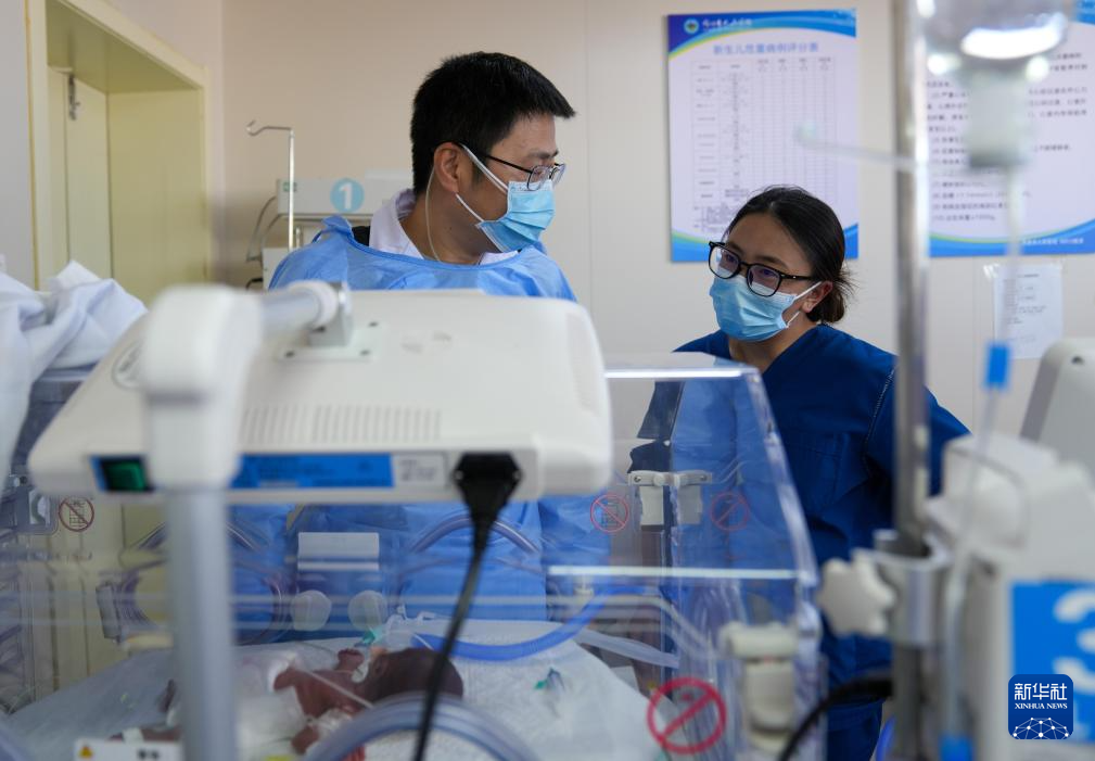 在那曲市人民醫(yī)院新生兒重癥監(jiān)護室,來自大連醫(yī)科大學附屬第一醫(yī)院的援藏醫(yī)生田聰亮(左)和護士旦珍合作為一名早產兒實施機械通氣治療(7月18日攝)。新華社記者 晉美多吉 攝 ??