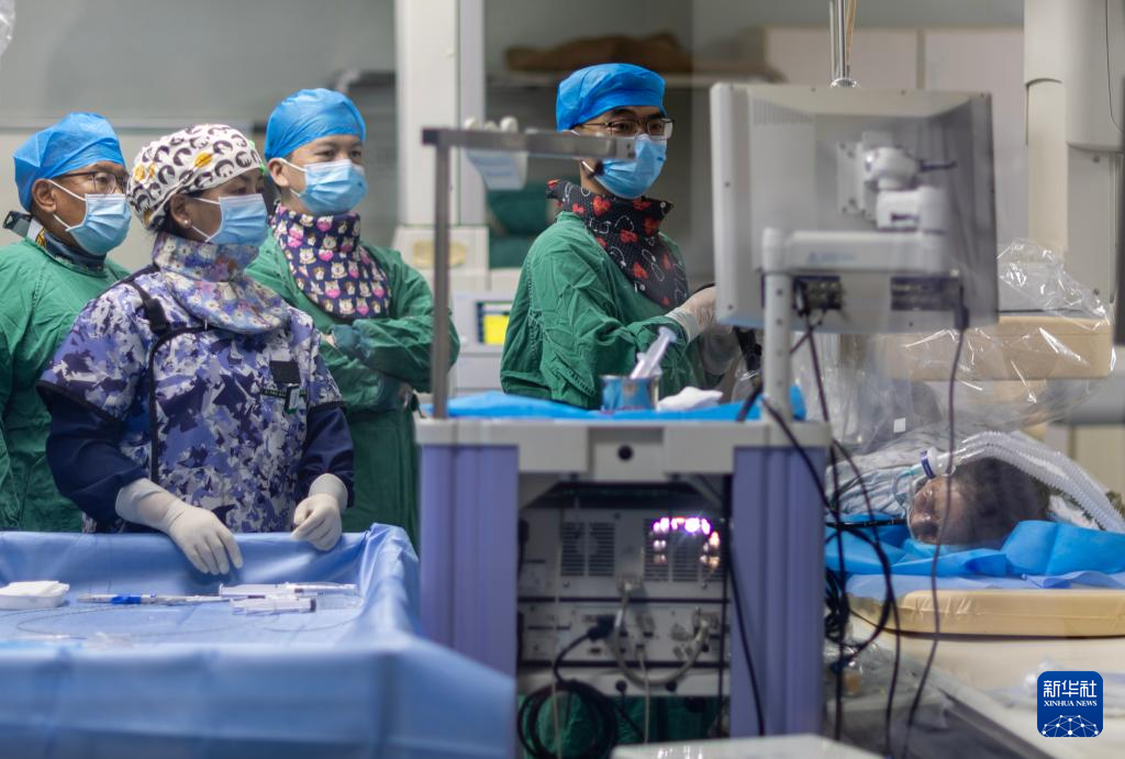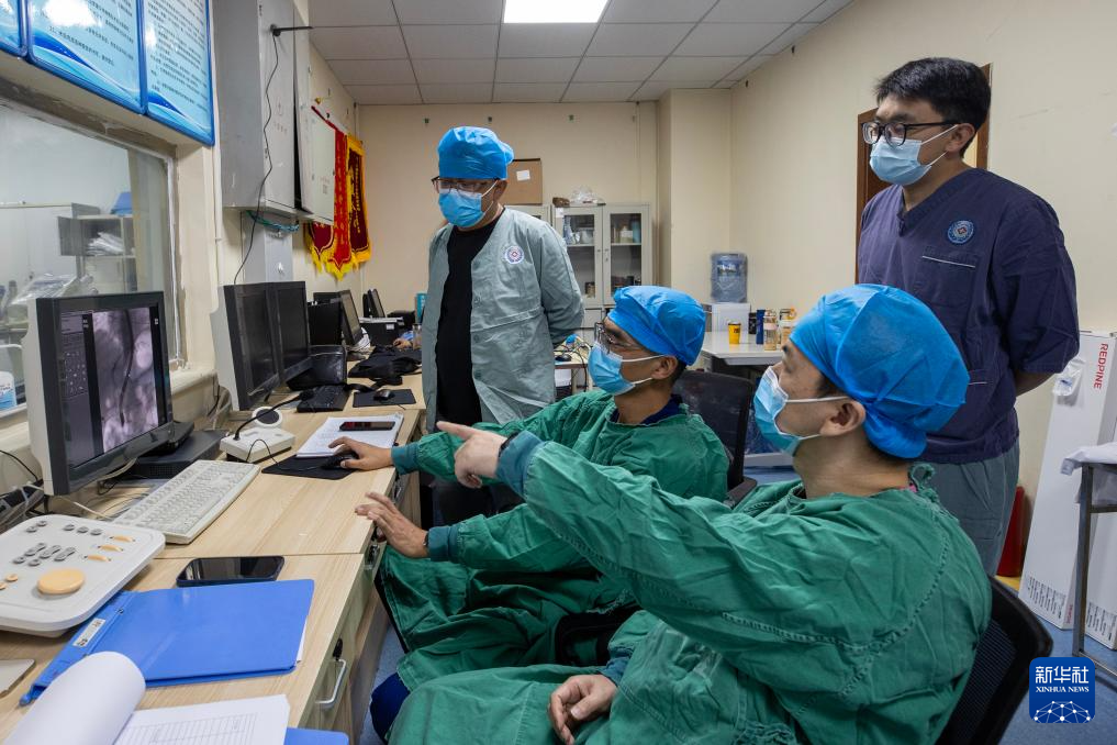 ?協(xié)和醫(yī)院第十批援藏醫(yī)生王強(左四)、第十一批援藏醫(yī)生蔣青偉(左三)和西藏自治區(qū)人民醫(yī)院醫(yī)生扎西(左一)在拉薩為患者施行內鏡逆行胰膽管造影術(8月5日攝)。新華社記者 姜帆 攝 ??