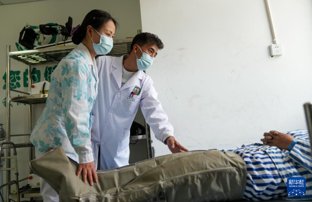 在昌都市洛隆縣人民醫(yī)院,從西藏大學醫(yī)學院畢業(yè)的醫(yī)生巴桑扎西和護士為患者進行康復治療(7月21日攝)。新華社記者 晉美多吉 攝 ??