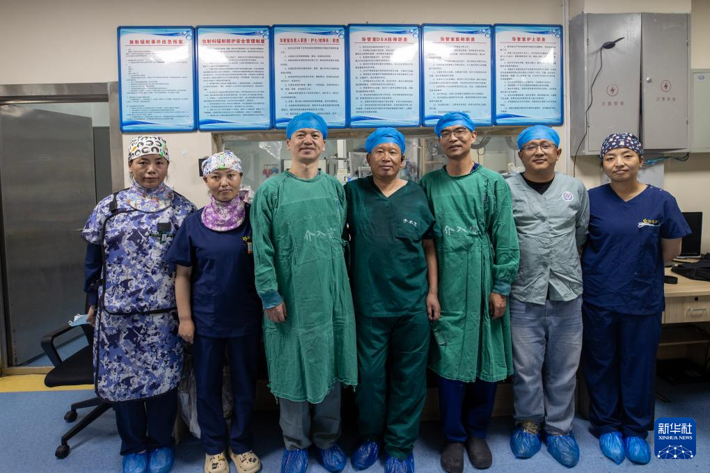 協(xié)和醫(yī)院第十批援藏醫(yī)生王強(右三)、第十一批援藏醫(yī)生蔣青偉(左三)和西藏自治區(qū)人民醫(yī)院醫(yī)生扎西(中)、旦增索朗(右二)及手術團隊,在拉薩為患者施行內鏡逆行胰膽管造影術后合影(8月5日攝)。新華社記者 姜帆 攝 ??