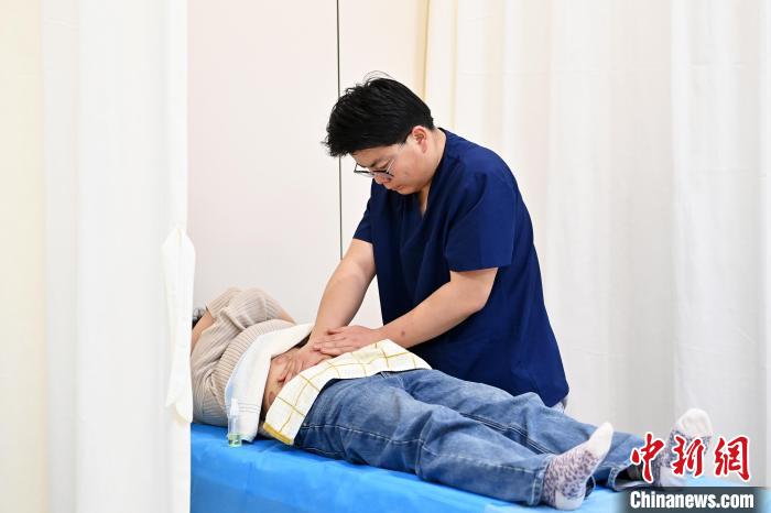 3月20日,甘肅蘭州,甘肅省中心醫(yī)院中醫(yī)減重門診醫(yī)生通過腹部推拿給患者進行減重治療?!【琶赖┰?攝
