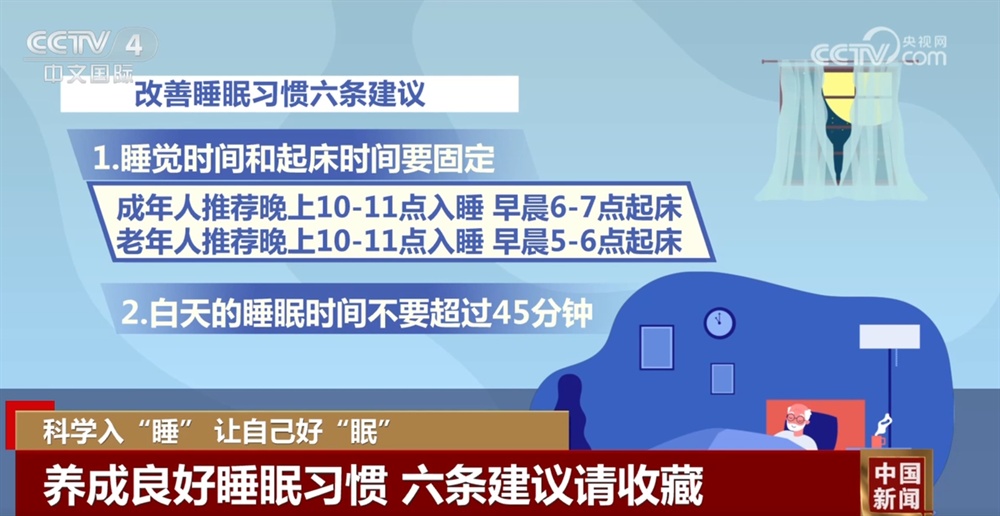 睡覺時間和起床時間要固定。成年人推薦晚上10—11點入睡,早晨6—7點起床。老年人推薦晚上10—11點入睡,早晨5—6點起床。