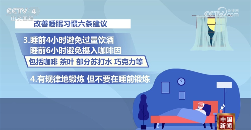 睡前4小時避免過量飲酒。睡前6小時避免攝入咖啡因,包括咖啡、茶葉、部分蘇打水、巧克力等。