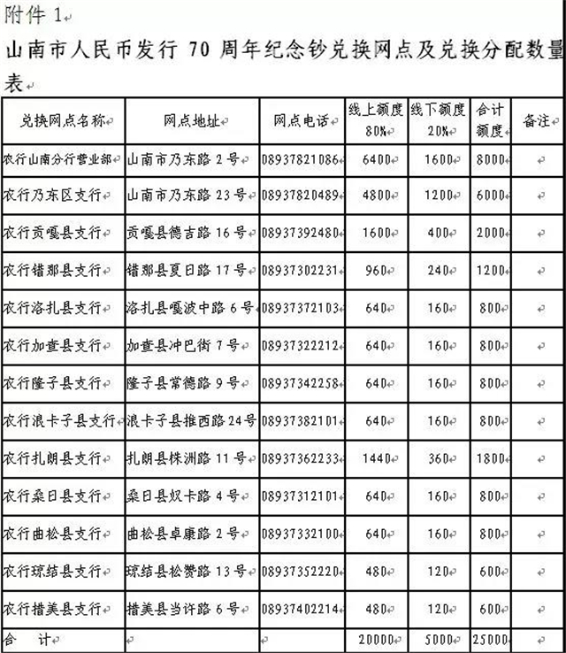 圖為山南市預(yù)約發(fā)行兌換網(wǎng)點及分配方案 圖片來源:中國人民銀行山南市中心支行