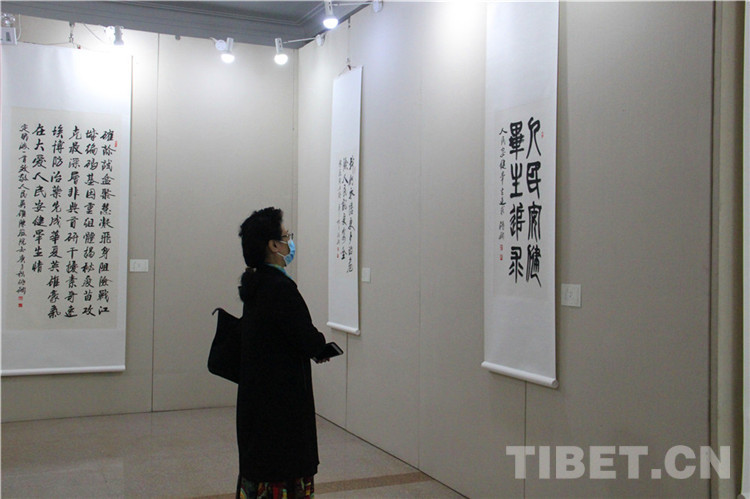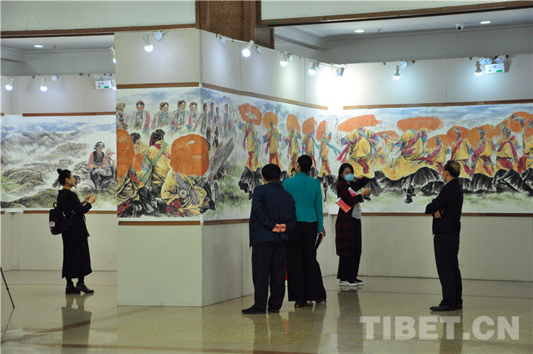 本次展覽由西藏自治區(qū)文學(xué)藝術(shù)界聯(lián)合會、西藏高山文化發(fā)展基金會主辦,西藏自治區(qū)人民政府駐北京辦事處和《一帶一路與茶馬古道》籌委會協(xié)辦,由張飆、鄭山麓、黃家林三位藝術(shù)家聯(lián)袂,以書法、詩詞、繪畫的藝術(shù)形式展現(xiàn)了在黨中央堅強領(lǐng)導(dǎo)下,西藏自治區(qū)取得的巨大成就,以及西藏自治區(qū)各族人民加強民族團結(jié)、建設(shè)美麗西藏的生動實踐。同時,本次展覽展品中還包括了記錄醫(yī)護工作者抗擊新冠肺炎疫情的優(yōu)秀作品。在上百件展品中,張飆創(chuàng)作的反映西藏自治區(qū)經(jīng)濟社會發(fā)展成就的詩詞、書法,鄭山麓創(chuàng)作的呈現(xiàn)西藏自治區(qū)舞蹈藝術(shù)魅力的60米國畫長卷《甲諧舞吉祥之盛世歡歌》,以及黃家林以布達拉宮為主題創(chuàng)作的油畫作品是展覽的亮點,吸引觀眾紛紛駐足。