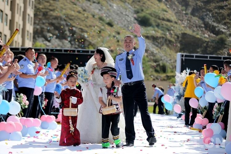 戍守邊境是使命,與相濡以沫的另一半攜手戍邊則成了最特別的浪漫。在婚禮現(xiàn)場,有一對穿著彝族和藏族服飾的花童引人注目?;ㄍ砗蟮男吕珊挠钍菑脑氐搅舨氐囊妥迕窬履锎蔚┭胱趧t是土生土長的藏族民警。這對“新人”的聯(lián)姻,既體現(xiàn)了民族團結(jié)與融合,更展示了西藏移民管理警察扎根奉獻邊疆的誓言和決心。