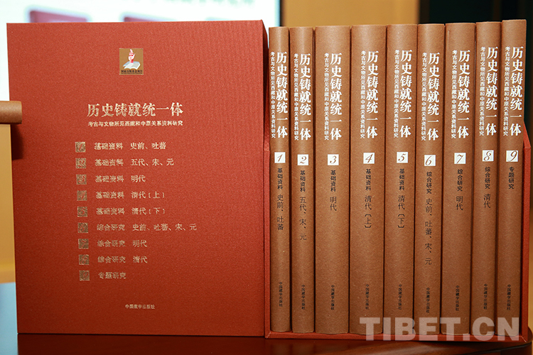 圖為發(fā)布會(huì)現(xiàn)場(chǎng)展覽的《歷史鑄就統(tǒng)一體:考古與文物所見西藏和中原關(guān)系資料研究》全套圖書 攝影:陳衛(wèi)國(guó)