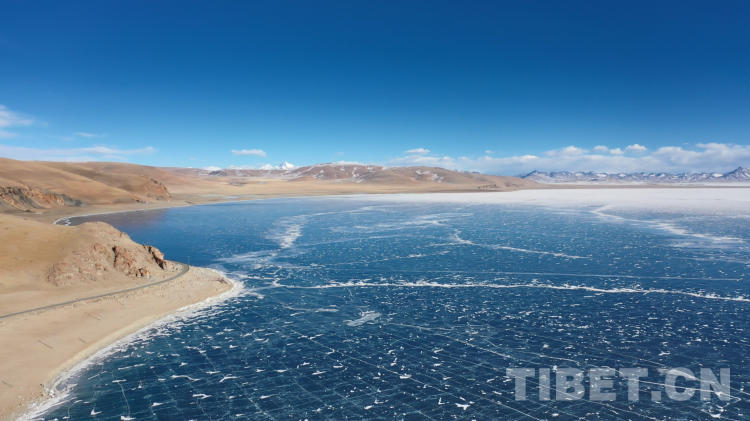 爬上一座山丘,視野陡然明亮開闊起來。原本土黃色的藏北天然牧場高低起伏,黑牦牛零星地散落在山坡,登上高處后,天際圣境納木錯(cuò)便映入眼簾。初春時(shí)節(jié)的拉薩依然春寒料峭,納木錯(cuò)的落雪還未完全消融,站在高處俯視,這片安靜的大湖被陽光反射得白茫茫一片。更幸運(yùn)的是碰到了晴好的天氣,白云與湖冰相襯,亦與遠(yuǎn)山相接,視線盡頭的念青唐古拉山脈直視無礙,畫面猶如“半池白云半池玉”般頗具美感。