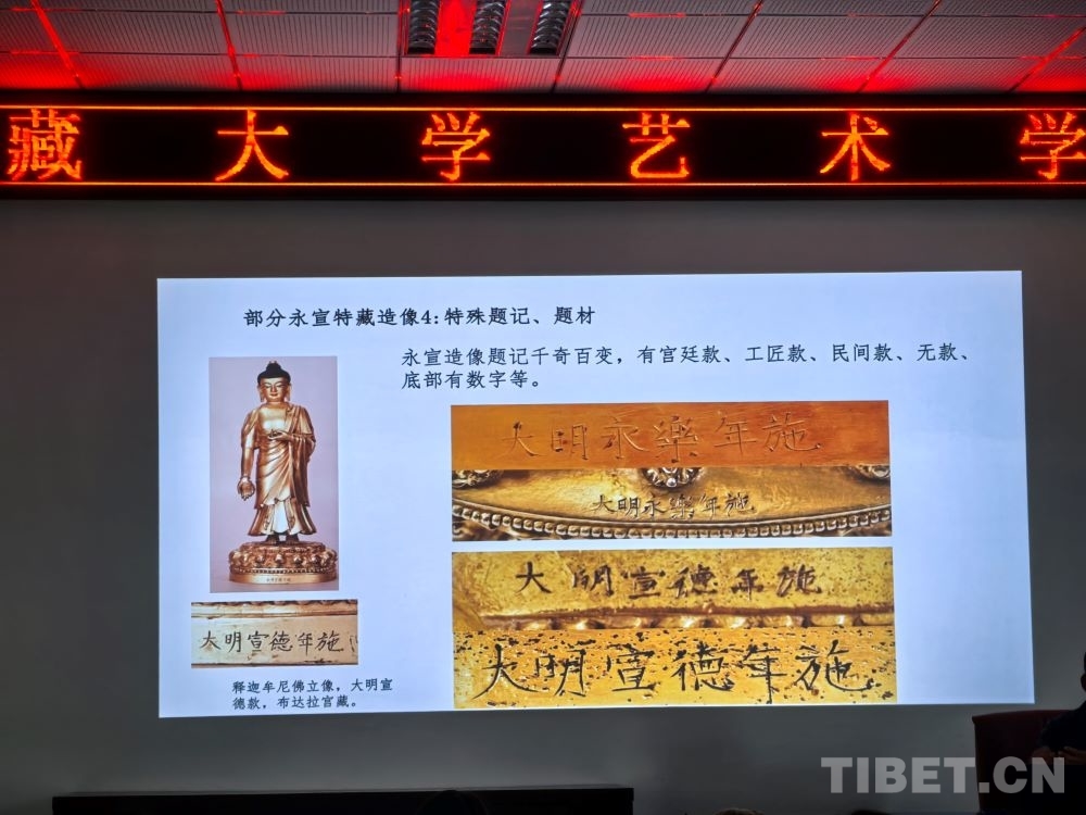5月8日,在西藏大學(xué)藝術(shù)學(xué)院內(nèi),一場題為《布達(dá)拉宮館藏大明永宣款造像相關(guān)問題考察——兼談“漢地造像殿”的復(fù)原陳設(shè)研究》的講座吸引了眾多學(xué)術(shù)愛好者。布達(dá)拉宮文物管理處文物研究室班旦次仁老師以大量西藏大明永宣款造像為案例,向在場聽眾介紹了這一時(shí)期的佛像如何以媒介的形式增強(qiáng)各民族間的感情。