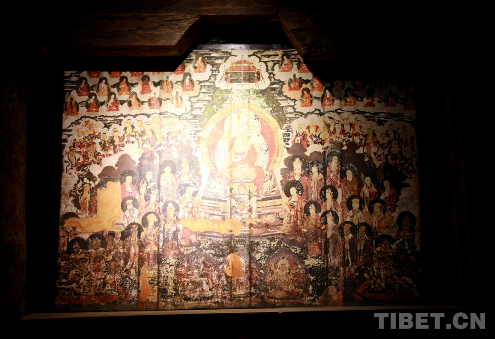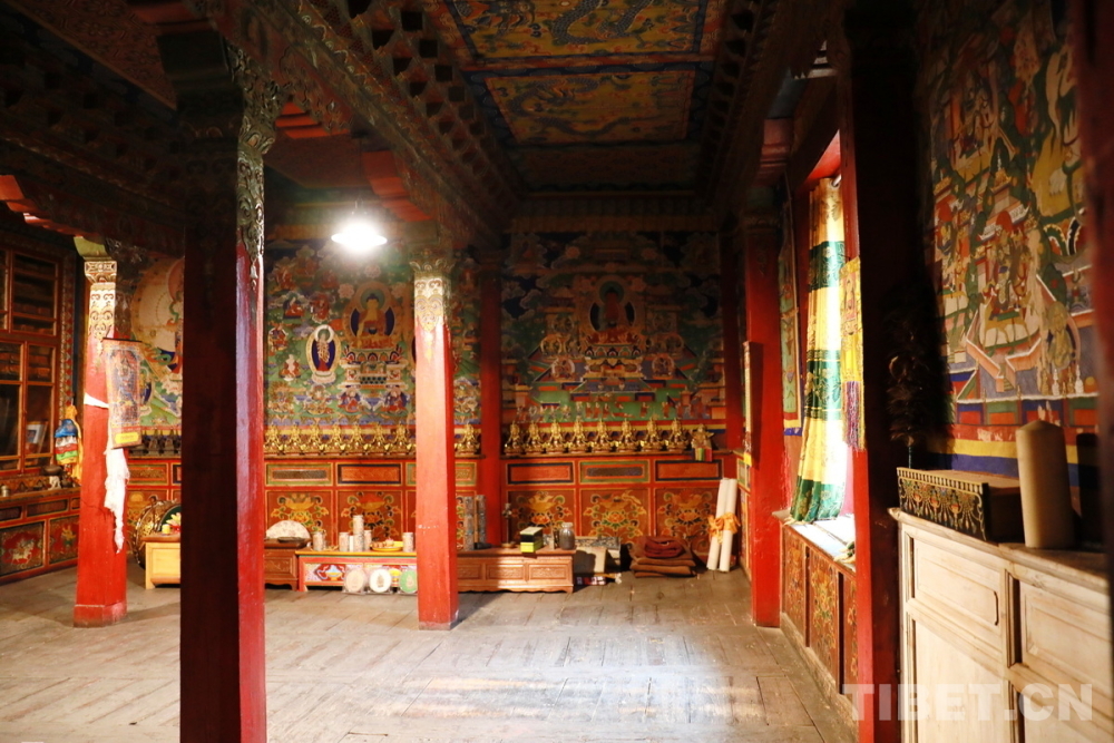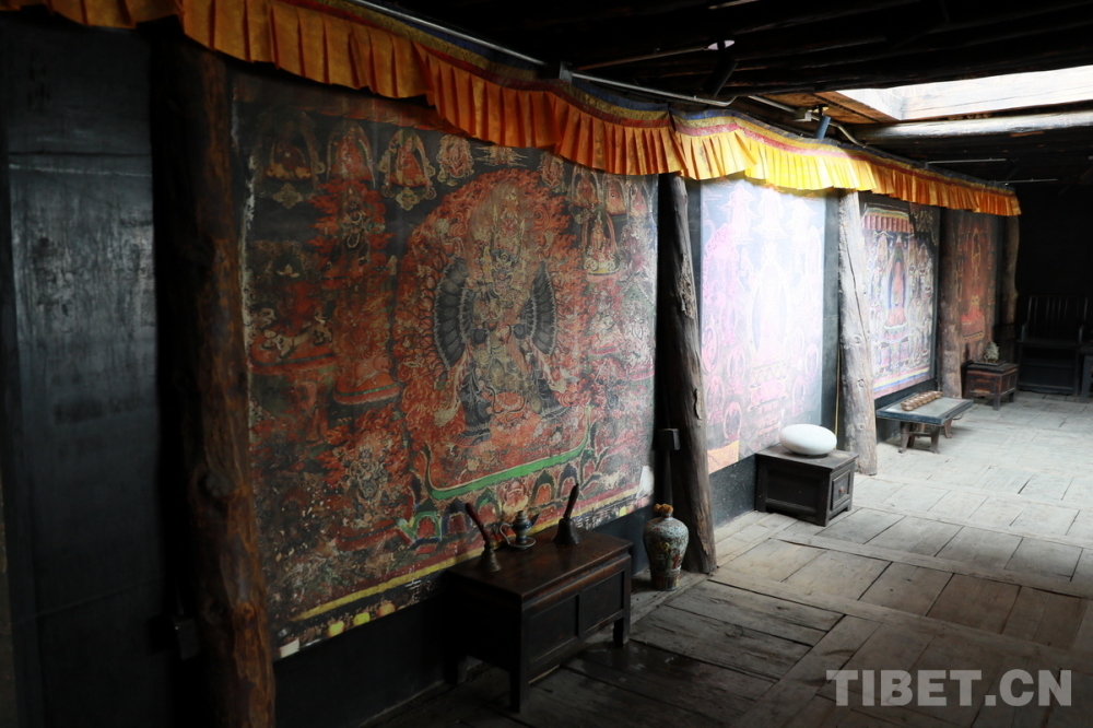 宗薩木府最驚艷的是其經(jīng)堂中歷經(jīng)380余年歷史仍色彩絢麗、保存完整的整堂壁畫(huà)。新中國(guó)成立后,宗薩木府曾被收歸公有,許多無(wú)房的當(dāng)?shù)刎毨罕姳话才抛∵M(jìn)了這里。“文革”時(shí)期,宗薩木府的經(jīng)堂被作為村里的倉(cāng)庫(kù),人們用報(bào)紙糊住壁畫(huà),使這些藝術(shù)珍品沒(méi)有受到“破四舊”的影響。